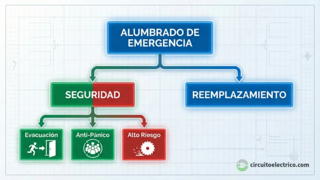 La normativa (ITC-BT-28 y UNE-EN 1838) lo divide en dos grandes ramas: el alumbrado de seguridad (diseñado para garantizar la evacuación segura y evitar el pánico) y el alumbrado de reemplazamiento (pensado para continuar trabajando).