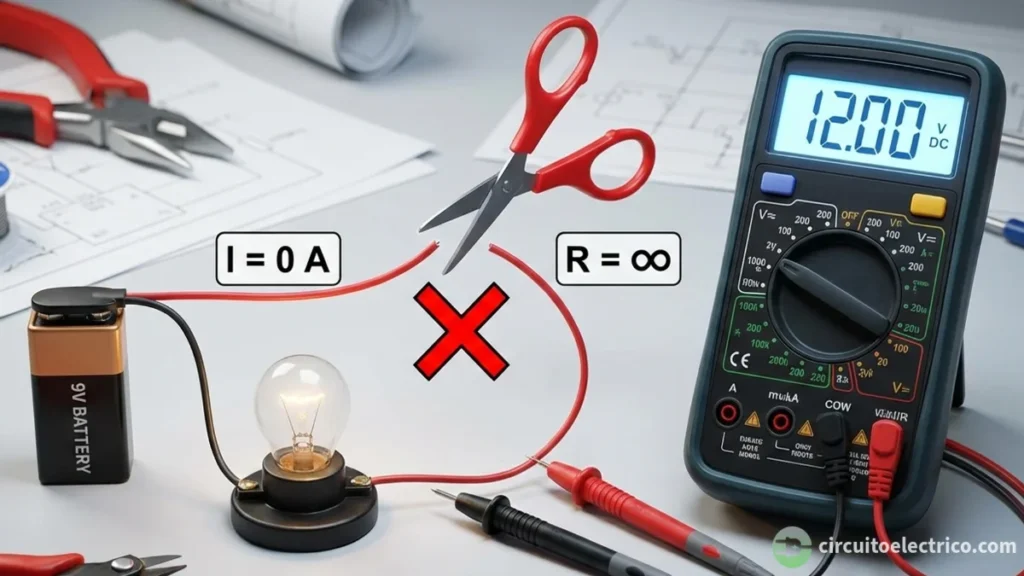 El punto de apertura introduce una resistencia teóricamente infinita (R → ∞ Ω) en el camino de la corriente.