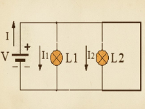 Como consecuencia, la corriente deja de circular por la lámpara L1, que cesa su funcionamiento, existiendo únicamente cortocircuito en 1 receptor. La lámpara L2 recibe ahora todo el voltaje de la batería, al eliminarse la caída de tensión asociada a la lámpara cortocircuitada. La resistencia total del circuito disminuye (al eliminarse la resistencia de la lámpara L1), lo que provoca un incremento de la corriente total según la Ley de Ohm.