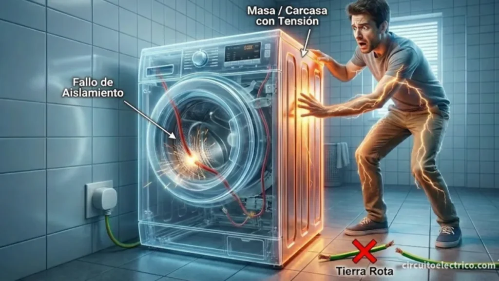 El peligro oculto: el contacto indirecto sucede cuando un fallo de aislamiento interno electrifica la carcasa metálica (masa), convirtiendo al electrodoméstico en una trampa eléctrica
