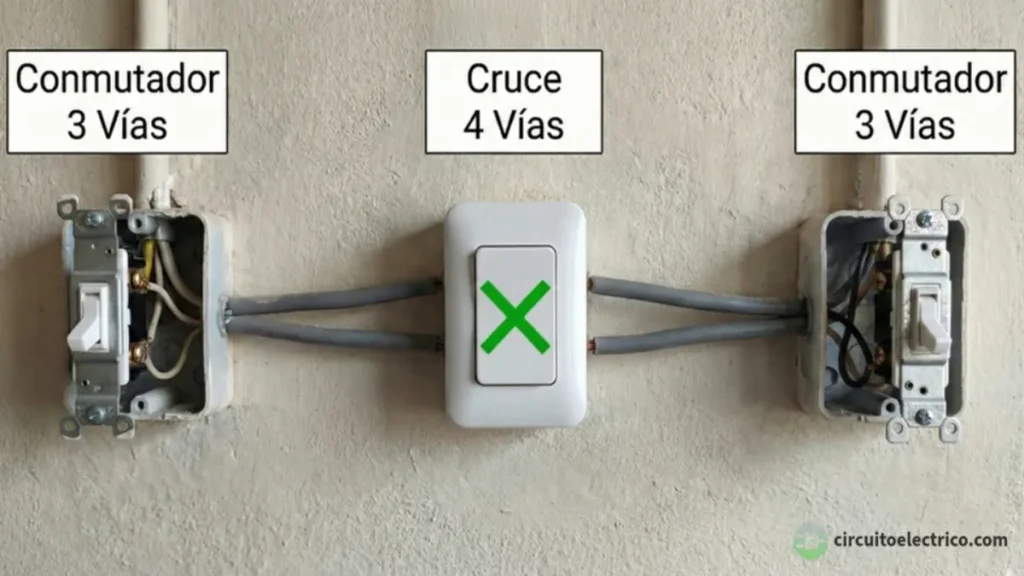 – Conmutador de cruce: ubicado centralmente entre conmutadores simples (1 o más unidades para 3 o más puntos).