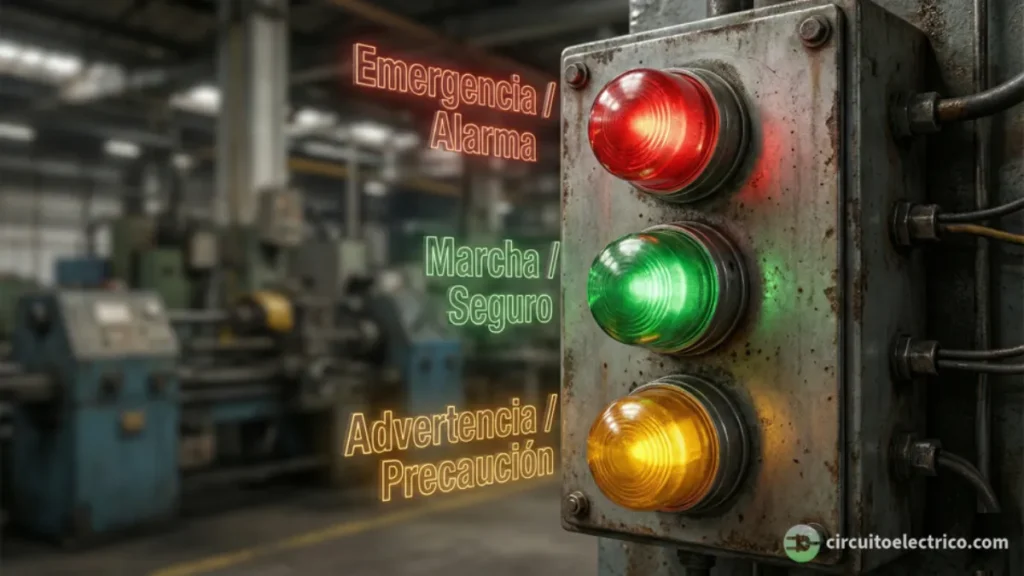 El color de las lámparas de señalización tiene un significado estándar en los sistemas de control, basado en normas internacionales como la IEC 60204 o la NFPA 79: