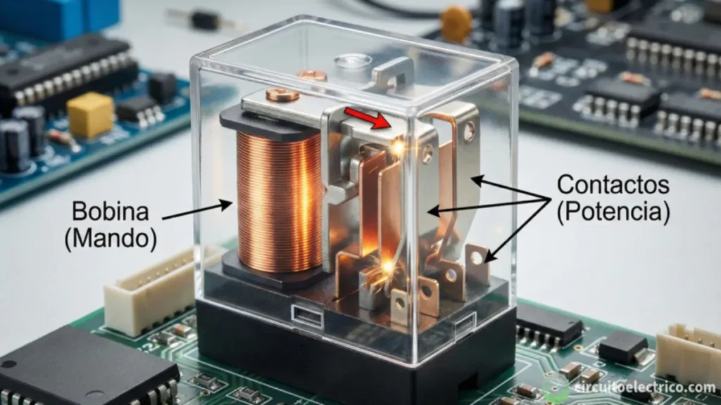 La armadura está conectada mecánicamente a los contactos del relé. El movimiento de la armadura, provocado por la atracción magnética, causa la apertura o el cierre de estos contactos, conmutando así el circuito que controla el relé.
