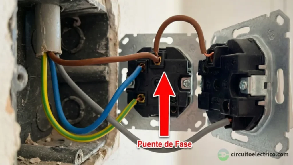 Como en el caso anterior, para que el enchufe proporcione tensión, es imprescindible que la fase se conecte antes del conmutador, no a su salida.