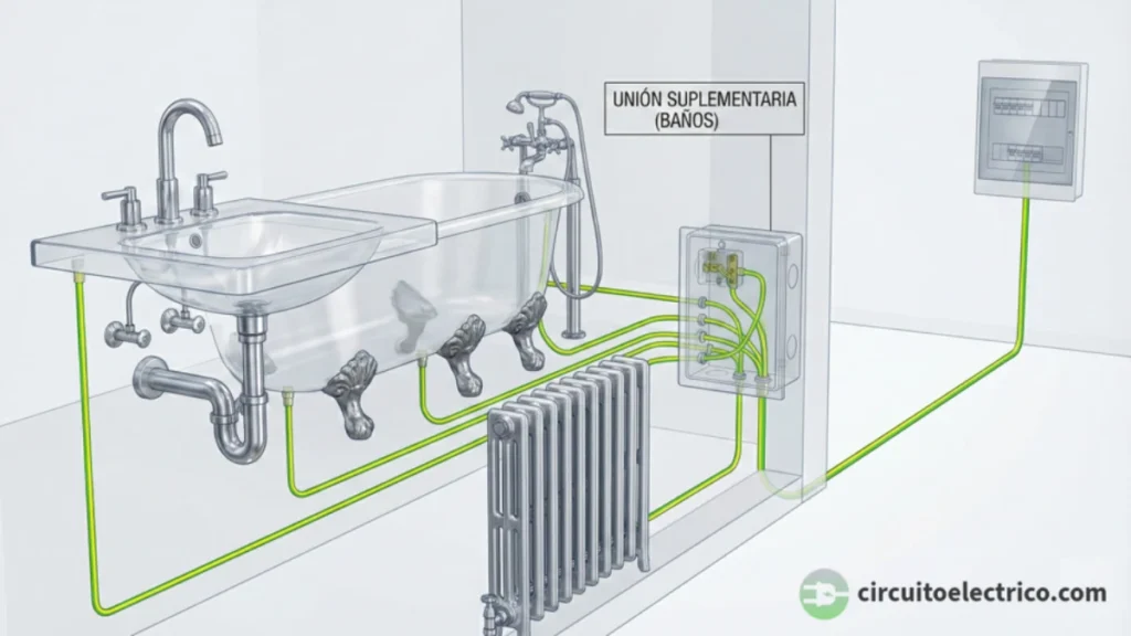 La jaula de seguridad invisible: en el baño, no basta con tener tierra en los enchufes. La normativa exige unir eléctricamente todas las partes metálicas accesibles (tuberías, radiadores) para evitar diferencias de potencial peligrosas en caso de fuga