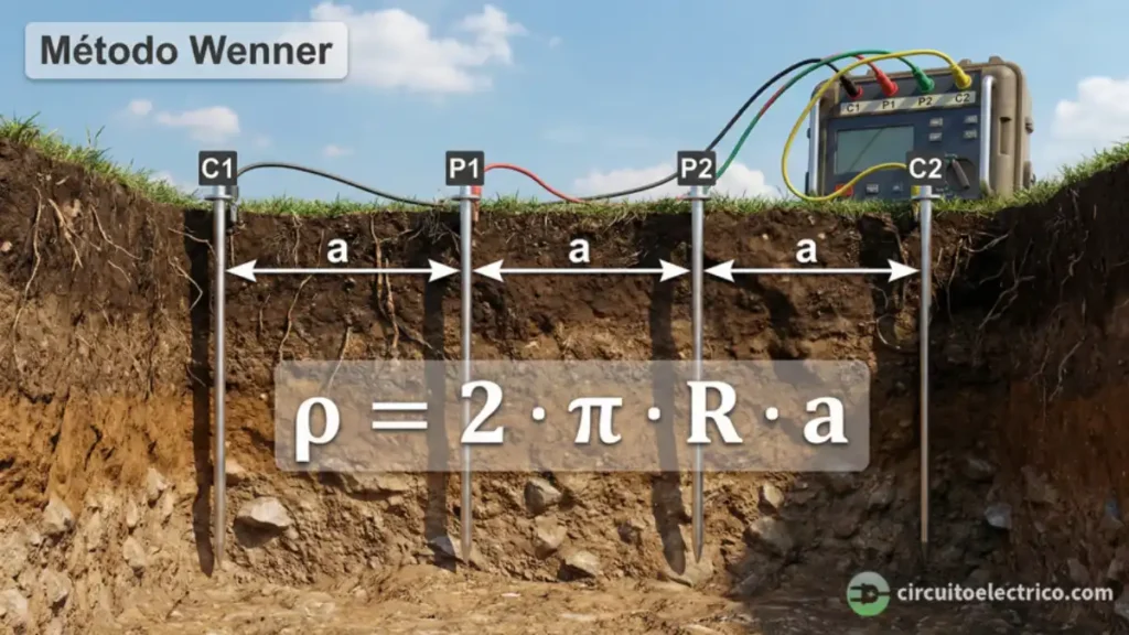 Antes de clavar la primera pica, necesitamos saber si el suelo es conductor (arcilla) o aislante (roca). La medición de la resistividad del terreno (ρ) se realiza principalmente mediante el Método Wenner (configuración de 4 picas equidistantes). Este dato es imprescindible para calcular cuántos electrodos necesitará nuestra futura instalación de puesta a tierra.