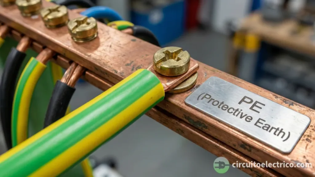 El conductor de protección, conocido técnicamente como PE (Protective Earth) o CP, es el famoso cable verde-amarillo. Su función es conectar todas las masas metálicas (carcasas de lavadoras, ordenadores) a la puesta a tierra del edificio.