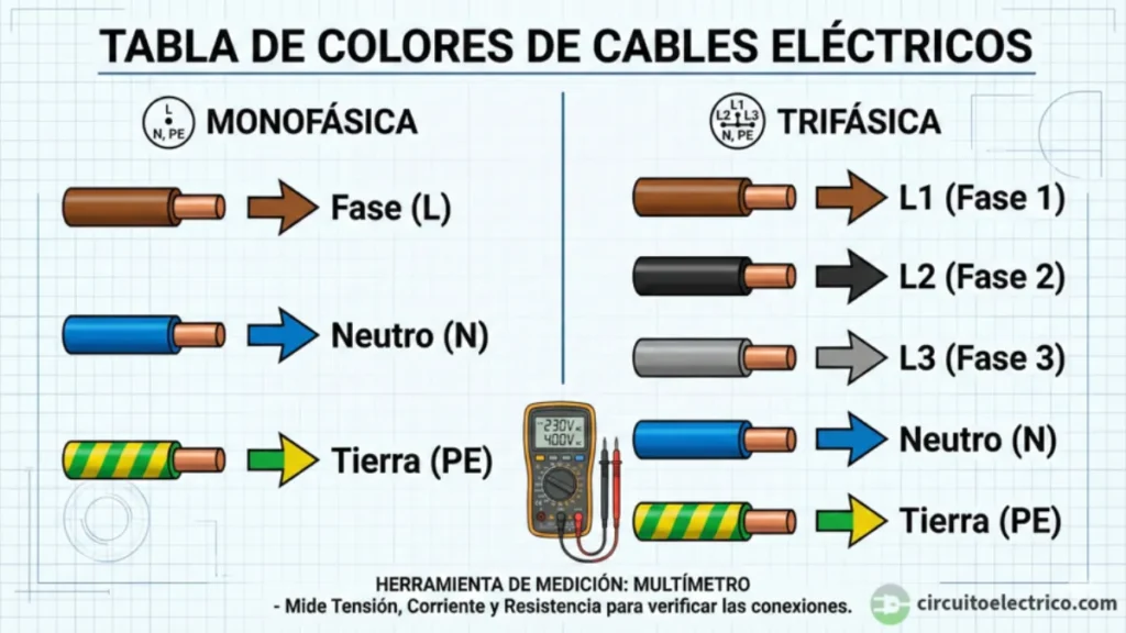 La identificación de conductores mediante el código de colores es vital para evitar accidentes. Según la norma (REBT / IEC 60446), cada cable tiene una función: el Azul es siempre Neutro, el Verde-Amarillo es Tierra, y los colores Marrón, Negro y Gris se reservan para las Fases (L1, L2, L3). A continuación, te explicamos la normativa completa y cómo identificarlos con un multímetro si los colores no se distinguen.